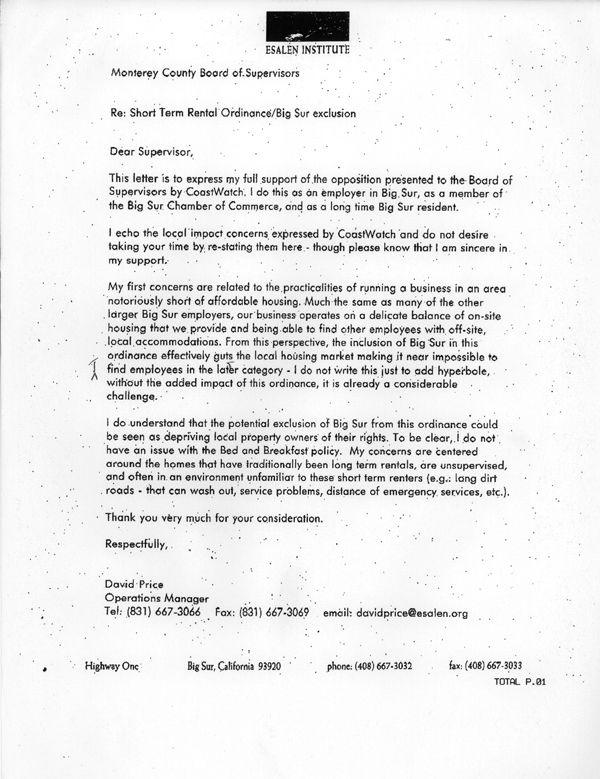 Esalen Institute opposing STR’s in 1997 Esalen Institute opposing STR’s – click on letter to read. Share this: Click to share on X (Opens in new window) X Click to share on Facebook (Opens in new window) Facebook Like Loading...