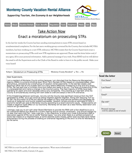 The legal counsel for the MCVRA (Monterey County Vacation Rental Association) ‘disagrees’ with the clarification document. Correspondence between the MCVRA attorney, Gary Patton, and County officials may be read HERE.